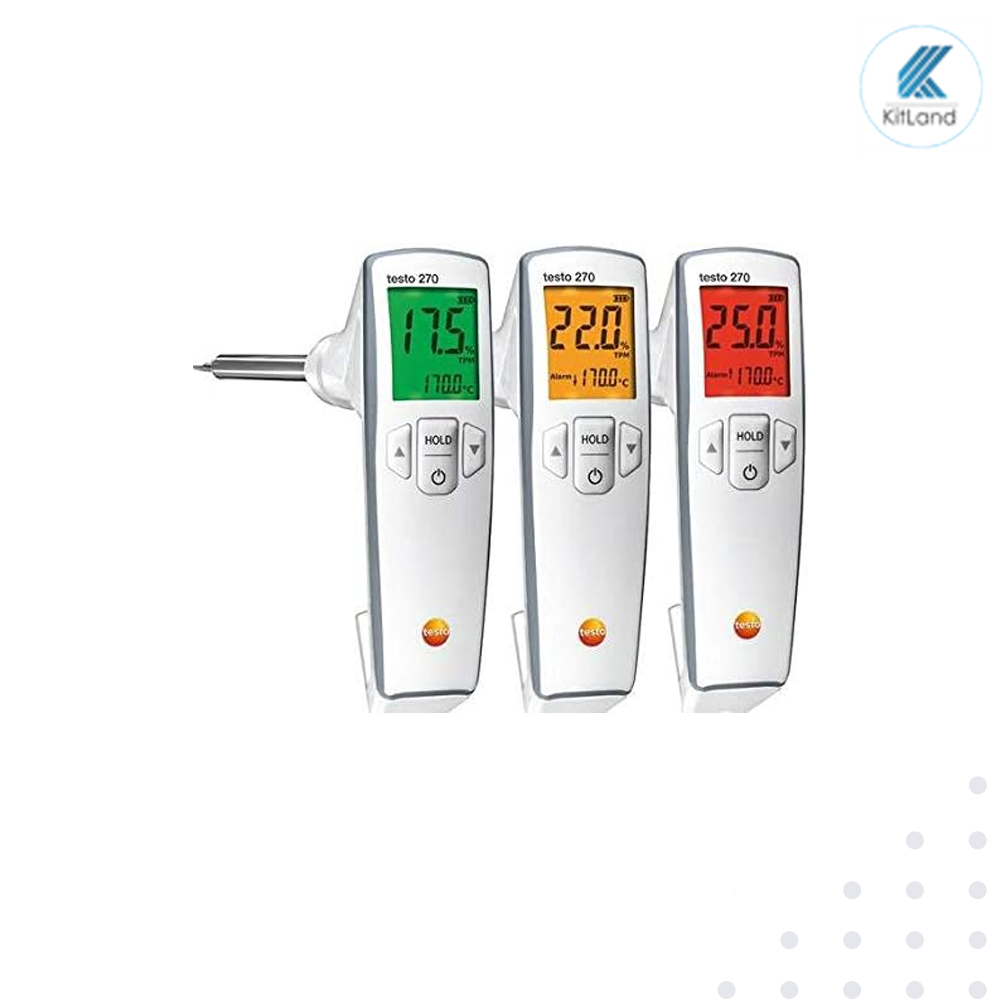 - الملحقات: جهاز اختبار زيت الطهي الرقمي تيستو 270 بما في ذلك الزيت المرجعي وحافظة بلاستيكية وبروتوكول المعايرة وبطاقة التدريب ودليل التعليمات والبطاريات | التطبيقات: المطابخ والمطاعم وما إلى ذلك